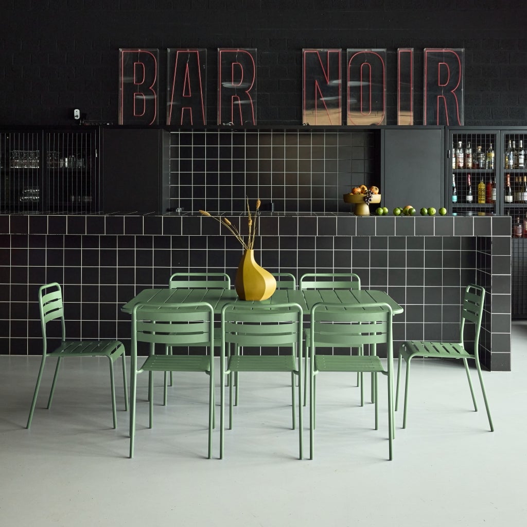 Table de jardin métal + 8 assises vert traitement antirouille. lattes et bords arrondis AMÉLIA