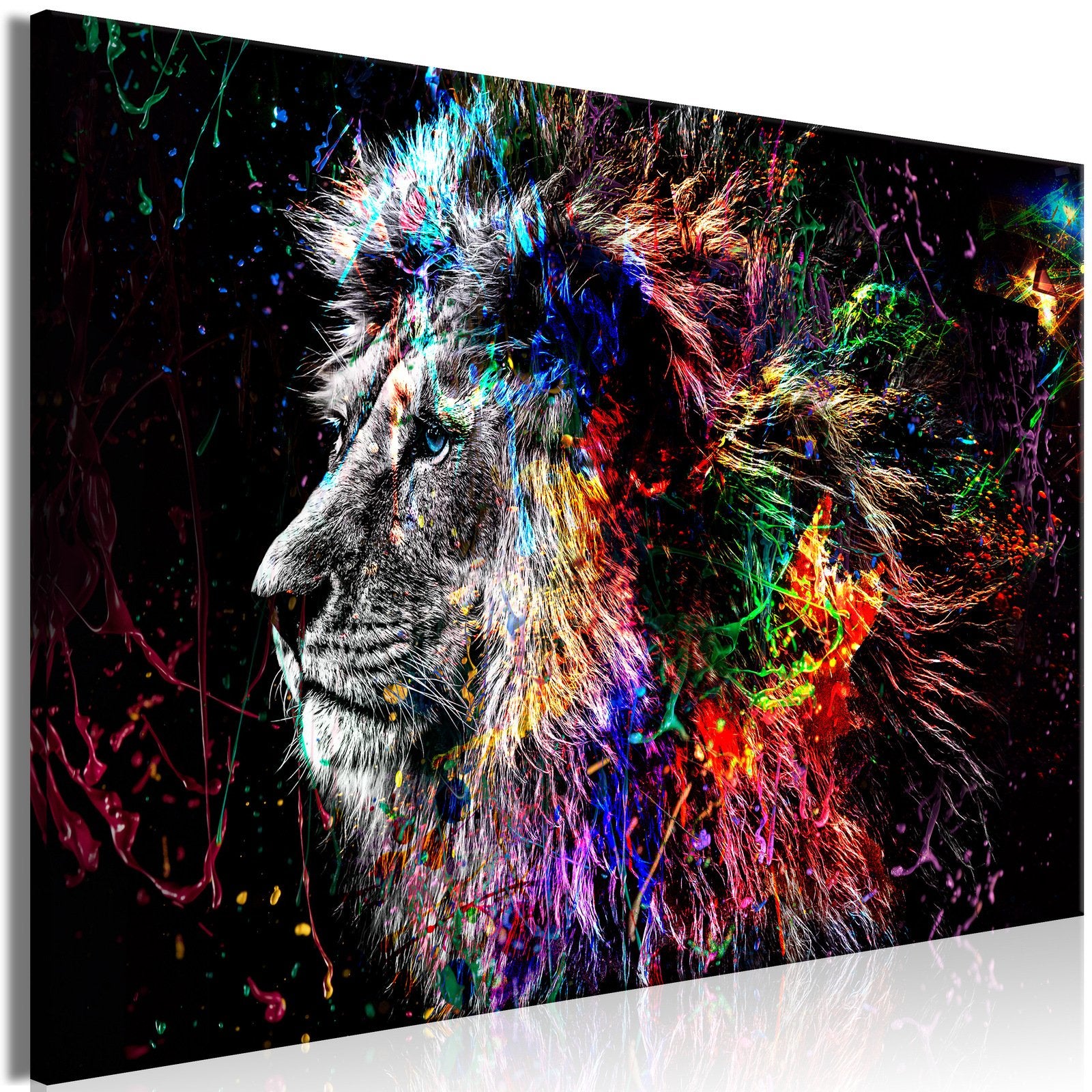 Le tableau 'Tableau - Crazy Lion (1 Part) Wide' est imprimé sur sur une toile d'Italie originale qui reflète parfaitement les couleurs. La toile est tendue sur un châssis fabriqué en bois massif naturel. Décoration de première qualité assure une une impression de haute gamme, grace a laquelle des couleurs sont intenses et des détails sont parfaitement reproduits, indépendamment de la taille du tableau.