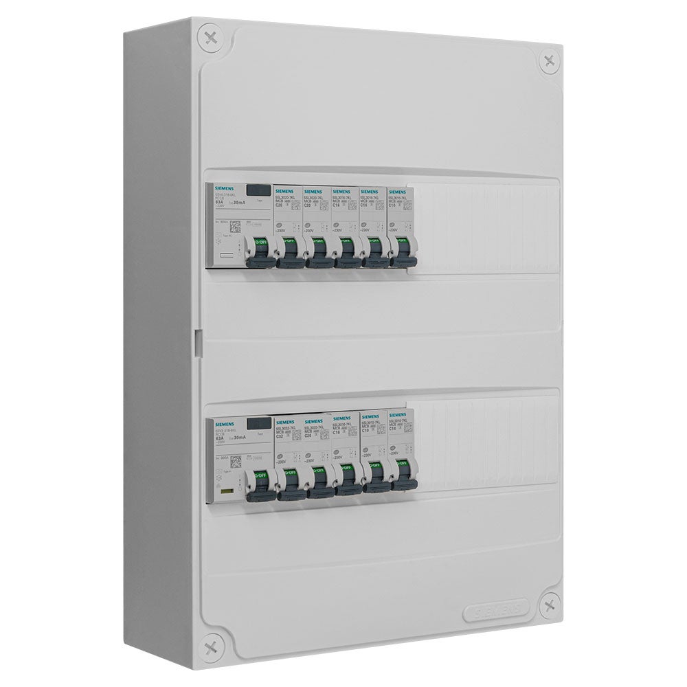 Tableau électrique Siemens 2 rangées, IP30, IK05, 350x250x97 mm, 2 interrupteurs différentiels 30mA 63A, 10 disjoncteurs variés