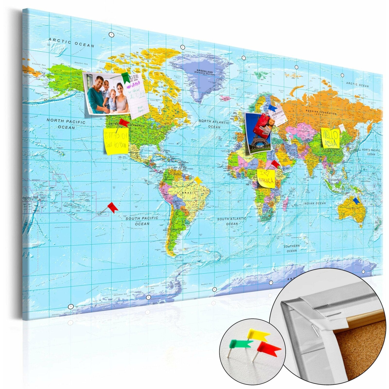 Le tableau en liège 'Orbis Terrarum' est plus léger que les décorations murales traditionnelles. Grâce à cela les tableaux décoratifs en liège peuvent être suspendus sur tous les endroits souhaités dans votre logement ou bureau. La toile imprimée est placée sur la plaque en liège, grâce à quoi les couleurs d'impression sont bien définies et les détails — même les plus petits — sont restitués. Vous pouvez créer un motif personnalisé sur votre mur en y plantant des punaises ou notes!
