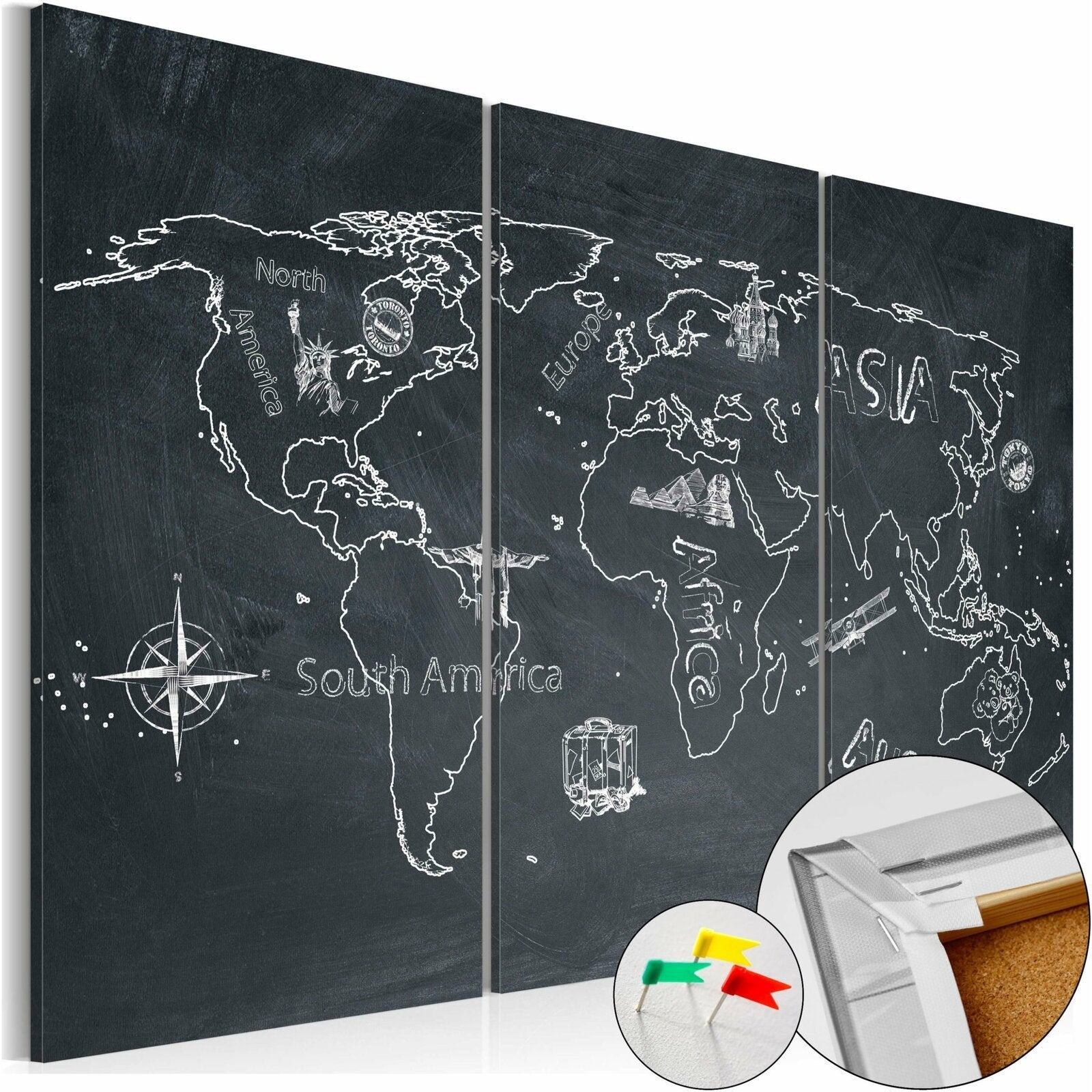 Le tableau en liège 'Travel broadens the mind (triptych)' est plus léger que les décorations murales traditionnelles. Grâce à cela les tableaux décoratifs en liège peuvent être suspendus sur tous les endroits souhaités dans votre logement ou bureau. La toile imprimée est placée sur la plaque en liège, grâce à quoi les couleurs d'impression sont bien définies et les détails — même les plus petits — sont restitués. Vous pouvez créer un motif personnalisé sur votre mur en y plantant des punaises ou notes!