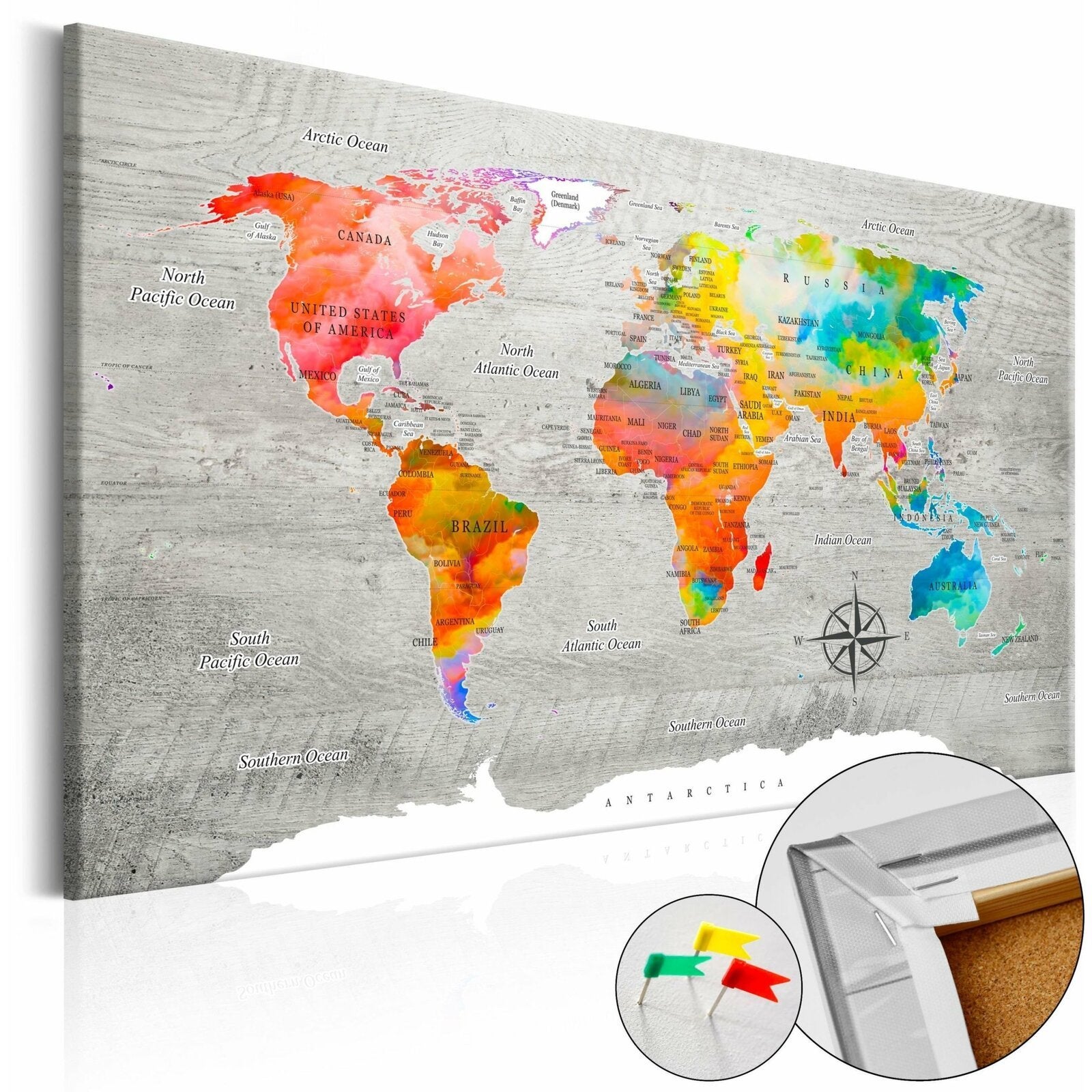 Le tableau en liège 'Multicolored Travels' est plus léger que les décorations murales traditionnelles. Grâce à cela les tableaux décoratifs en liège peuvent être suspendus sur tous les endroits souhaités dans votre logement ou bureau. La toile imprimée est placée sur la plaque en liège, grâce à quoi les couleurs d'impression sont bien définies et les détails — même les plus petits — sont restitués. Vous pouvez créer un motif personnalisé sur votre mur en y plantant des punaises ou notes!