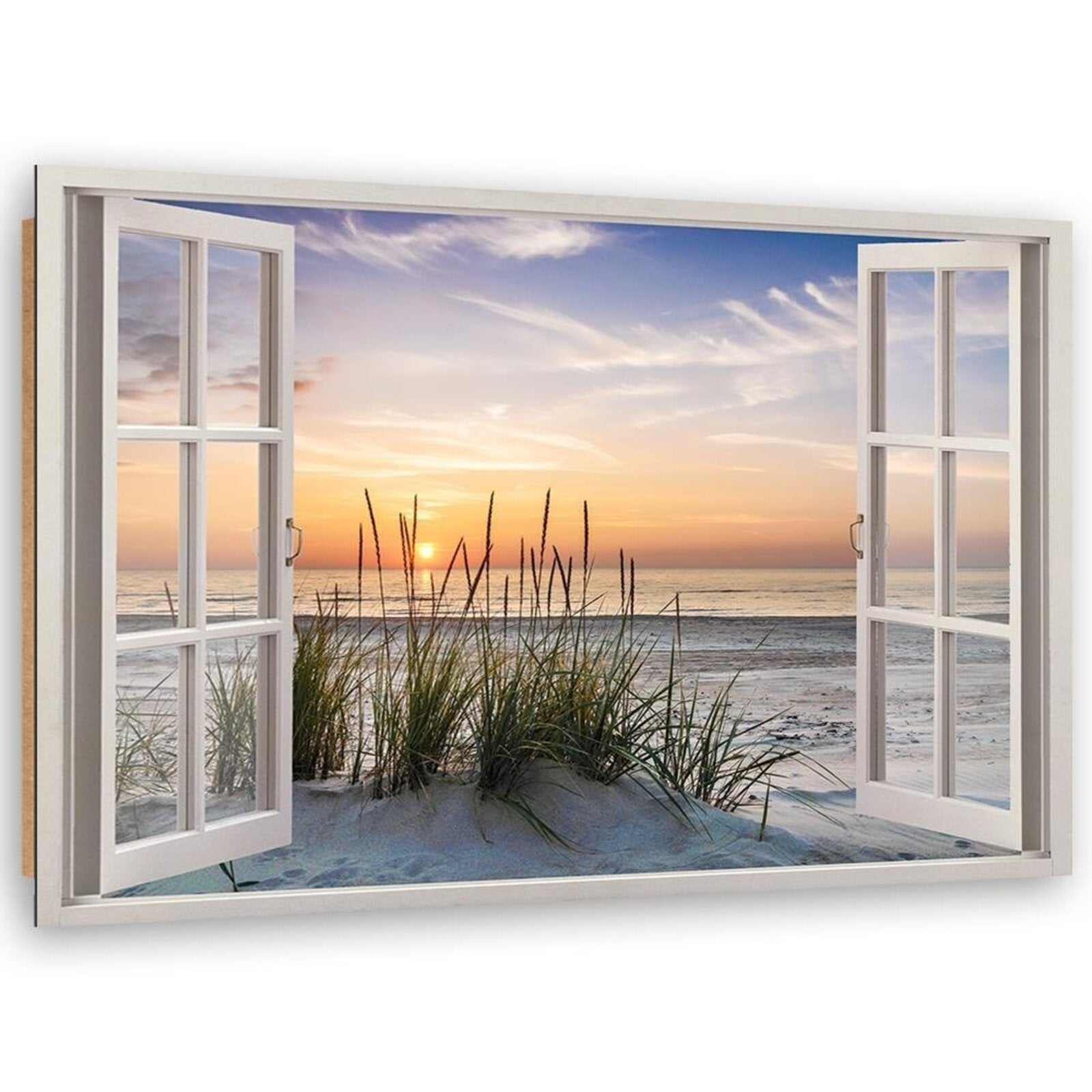 Tableau fenêtre en bois donnant sur la plage - 120 x 80 cm