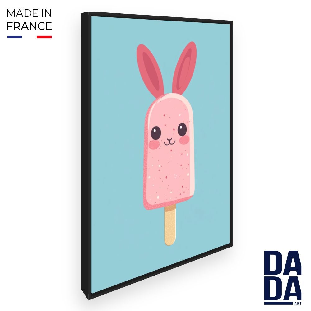 Tableau imprimé et encadré pour enfants 'Crème glacée lapin' / 50x70cm / Cadre Noir / Fabriqué en France / Toile murale / DADA ART