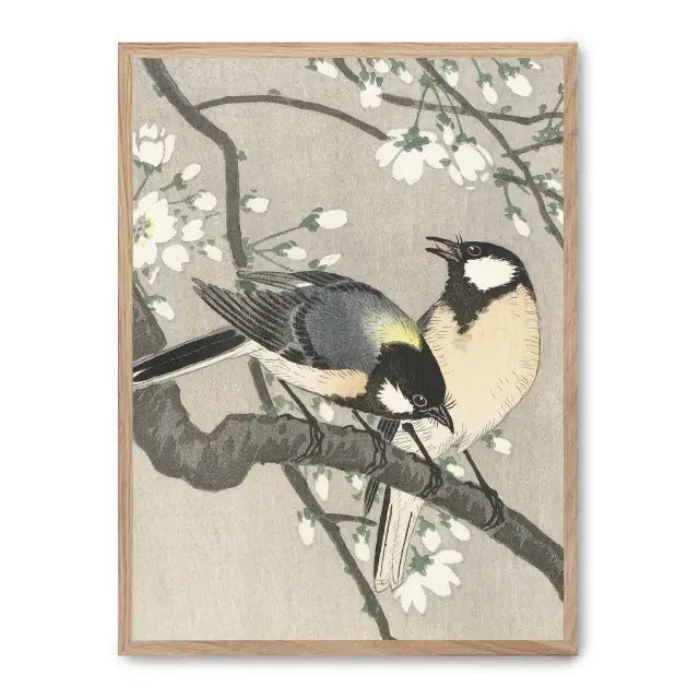 Tableau oiseaux de printemps Matériel : Affiche imprimée sur papier premium 180gr, montée sur un cadre en bois MDF finition chêne. Couleur: multicolore L'illustration montre deux oiseaux perchés sur la branche d'un arbre en fleurs. Les oiseaux symbolisent la beauté de la nature et l'arrivée du printemps. Affiche imprimée sur papier premium 180g, montée sur un cadre en bois MDF finition chêne. 30x40cm