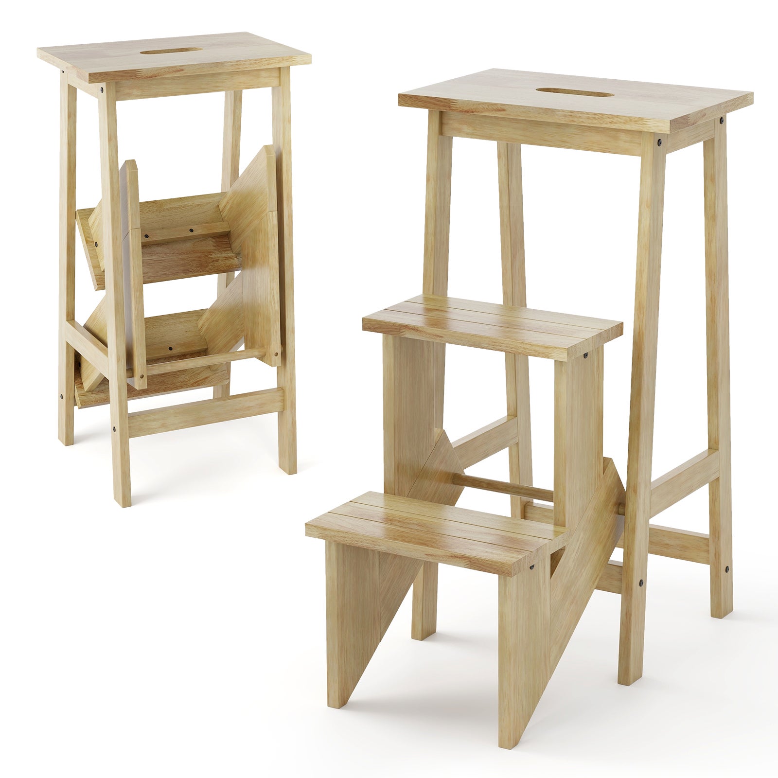 Tabouret Escabeau en Bois Hévéa Pliant, Marchepied 3 Marches, Escabeau Multifonctionnel Réversible, Portable, 57 x 41 x 76 cm, Capacité 310kg, Naturel