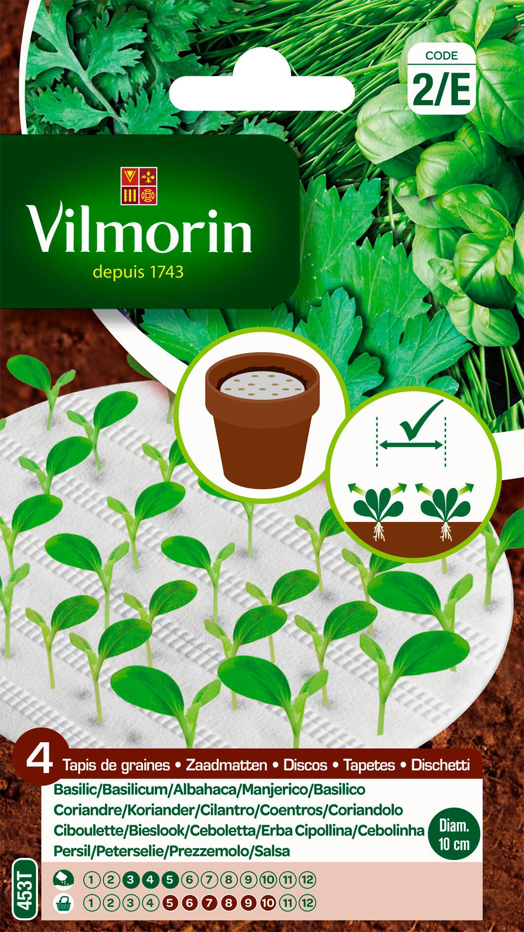 4 tapis de graines de 10cm de diam. Pour faire soi même ses pots d'aromatiques à la cuisine, sur le balcon ou la terrasse : Basilic, Coriandre, Ciboulette et Persil à portée de main pour aromatiser tous vos plats. Composition : B
