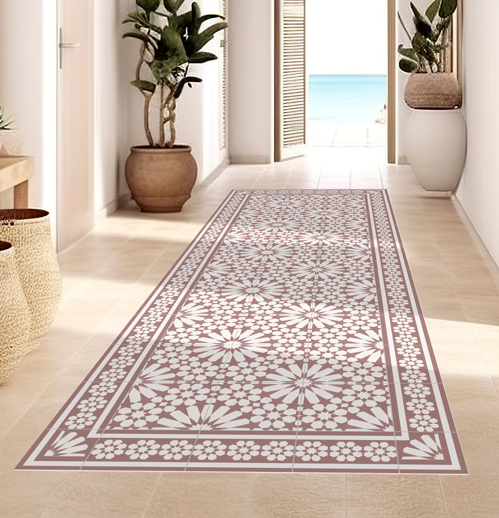 Tapis antidérapant en vinyle Samara terracota 80x300 cm - PVC imprimé, lavable, ignifuge, pour le salon ou la cuisine, style hydraulique