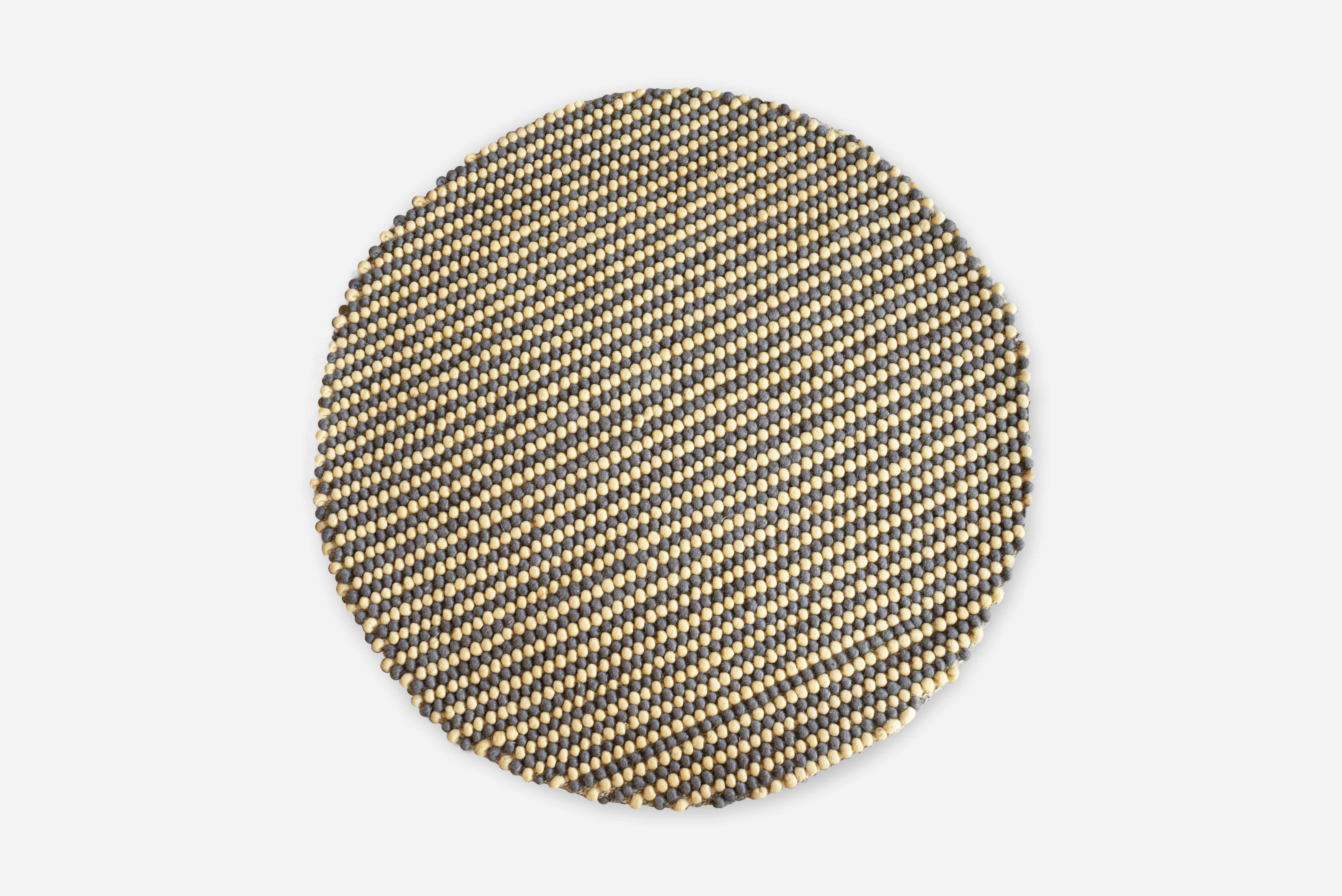 Tapis enfant rond aux lignes jaunes et grises Réalisé avec des boules de feutre de laine. Parfait pour n’importe quelle chambre d’enfant. Disponible dans d'autres couleurs. Mesuré Ø100cm