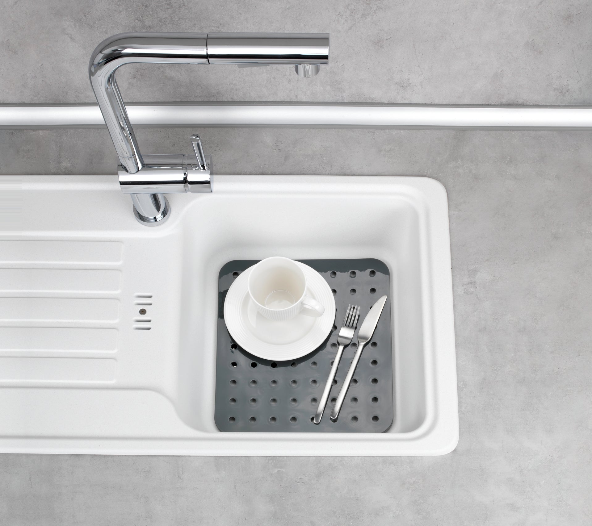 Fond d'évier épais qui protège l'évier des éraflures et de la casse de vos verres et vaisselles. La géométrie de trous spéciale combinée au système d'écoulement réduit considérablement les projections d'eau lors du remplissage de l'évier.