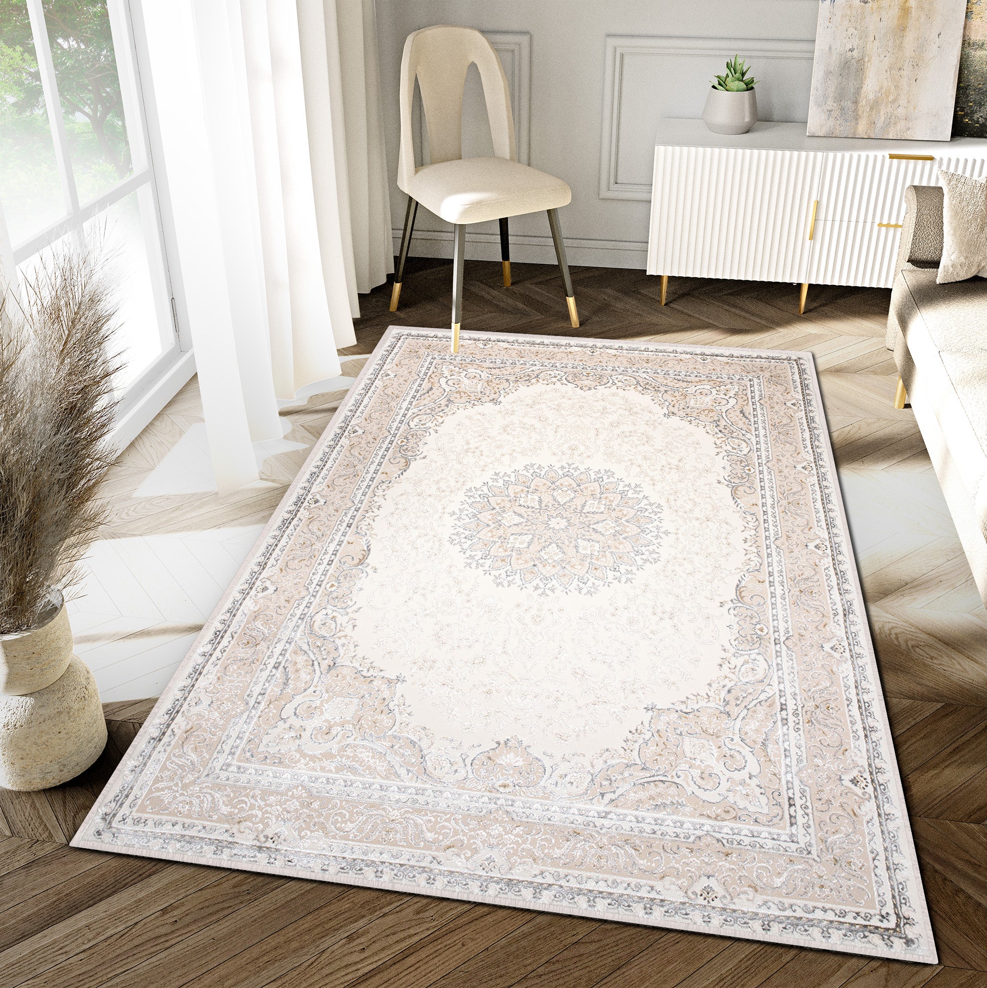 TAPISO Hera Tapis Salon Chambre Brillant Crème Beige Gris Vintage Médaillon Floral Ornamental Bordé Moucheté Effet 3D OEKO-TEX 80 x 150 cm