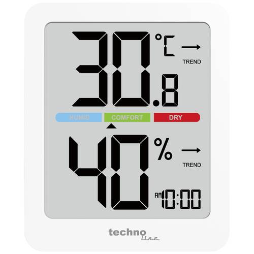 Techno Line Thermo-hygromètre blanc Thermomètre/hygromètre WS9456 Pour le réglage ou la suspension Support magnétique puissant Ce texte a été traduit par une machine. Equipment: Indicateur de confort. Heure Température intérieure en °C ou °F. Affichage de la tendance de la température L'affichage du confort de la pièce (HUMID, COMFORT, DRY) est calculé en fonction de l'humidité de l'air Humidité intérieure Affichage de la fin de l'humidité de l'air Les valeurs MIN et MAX sont enregistrées et peuvent être récupérées Rétroéclairage orange après avoir tactile le capteur de contact au-dessus de l'appareil Technical specifications: Couleur du boîtier: blanc · Etalonnage: d'usine (sans certificat) · Fonctions (station météo): humidité intérieure,température intérieure,affichage confort,valeurs Max/Min · Gamme de mesure (humidité de l'air intérieure): 20 à 95 % · Gamme de mesure (température intérieure): 9,9 à 49,9 °C · Matériau: plastique · Poids (station): 105 g · Tension d'alimentation station: piles-boutons CR 2032 (2x), fournies