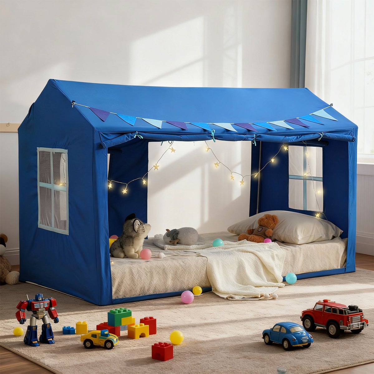 Design charmant avec des étoiles : Cette tente a une forme de maison avec 6 mètres de guirlande lumineuse étoilée et des décorations de drapeaux qui transforment la chambre de votre enfant en un pays des merveilles magique. C’est une mise à jour instantanée de la décoration de la chambre que les enfants adoreront.