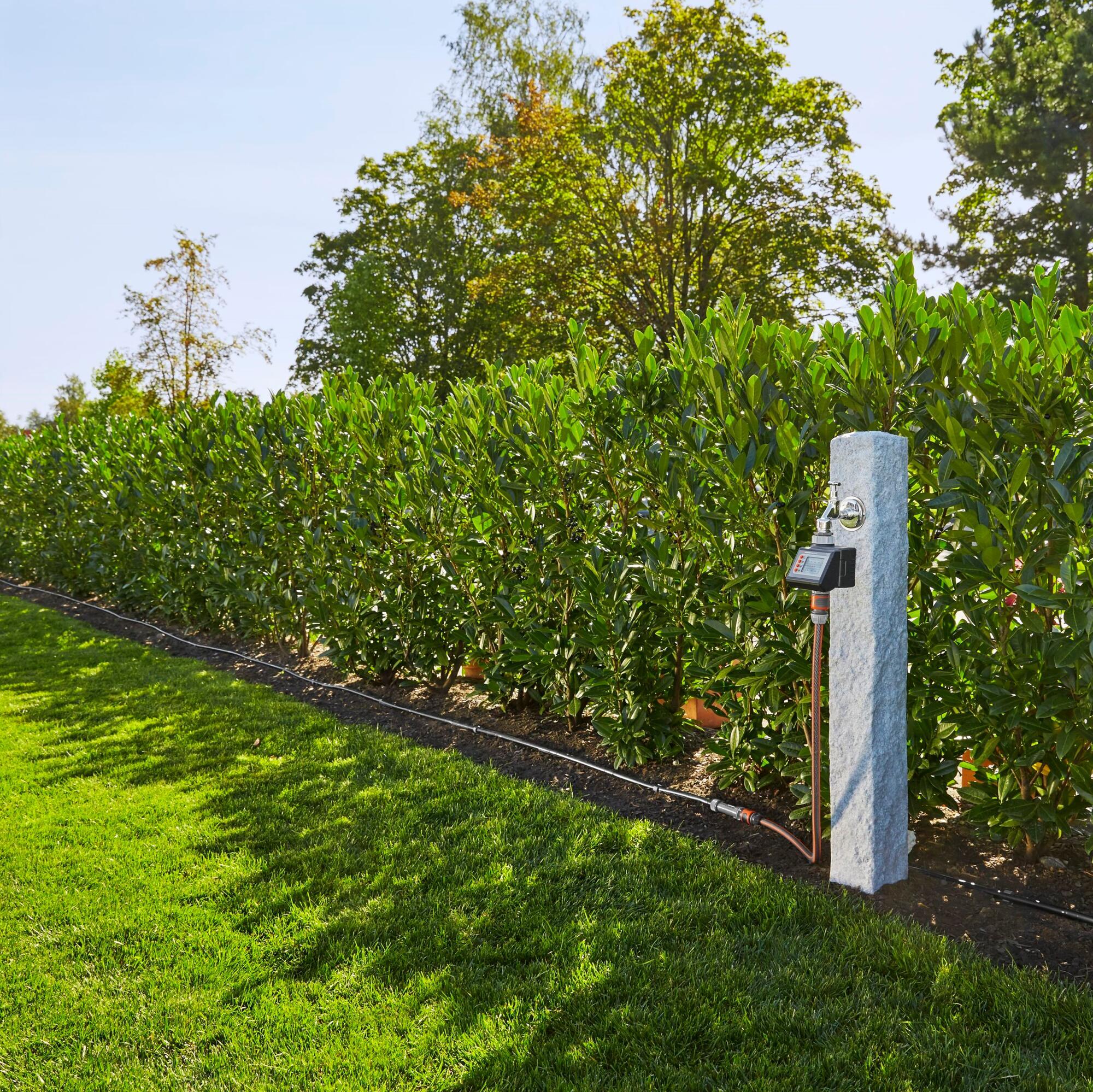 Elément indispensable pour automatiser l'arrosage, le programmateur se pose au départ de l'installation, sur le robinet d'eau alimentant votre système de goutte-à-goutte.
