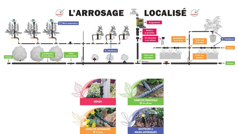 Afin de prévoir les bons composants dans les bonnes quantités, il est conseillé de réaliser un plan précis de votre jardin et de la ou les surfaces à arroser. Mesurez la distance entre le point d'eau (robinet, récupérateur d'eau) et chaque surface à arroser, ainsi que la surface ou longueur de chaque zone. Vous pourrez ainsi identifier les longueurs de conduite principale et secondaire et les différents raccords et dérivations nécessaires. Choisissez enfin la quantité et type de goutteurs ou asperseurs souhaités selon les types de plantes à arroser. Le nombre de goutteurs installables dépendra du débit max du réducteur de pression installé.