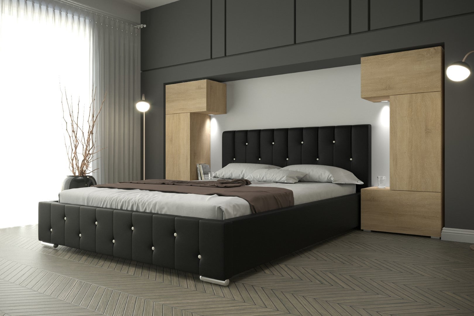 L'ensemble comprend : 2 armoires de rangement design attenants au lit