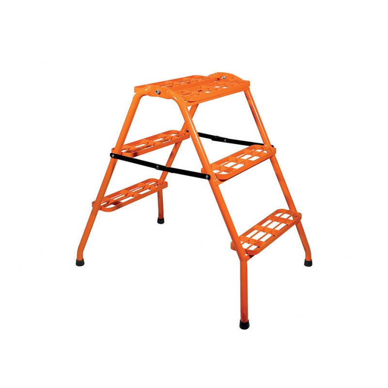 L'escadouble 3 marches est composé d'un montants en tube acier d'un diamètre de 22 mm. Les marches sont en acier ajourées d'une largeur de 95 mm et la largeur hors tout à la base fait 500 mm. De plus, l'épaisseur replié fait 215 mm, la hauteur de la dernière marche 0,665 m pour un poids total de 6,59 kg.