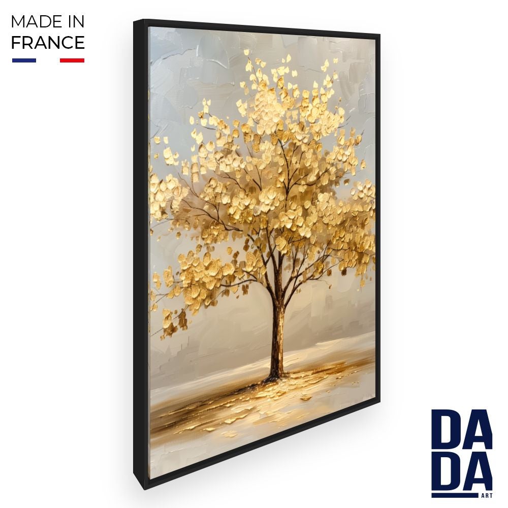 Ce tableau élégant et lumineux dépeint un arbre aux feuilles dorées, ajoutant une touche de luxe à l'espace.