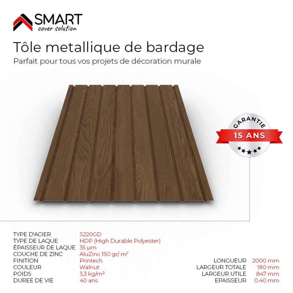 Tôle bac acier - Bardage - plaque H12 Coloris Walnut Printech Dimensions 2000x910x0.40mm