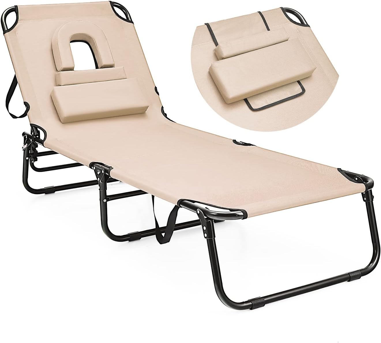 ——Design humanisé : Notre chaise longue est équipée d'oreillers détachables et d'un trou pour le visage, vous permettant d'utiliser le téléphone ou de lire en bronzant le dos. Le design ergonomique vous donne une relaxion complète du corps.