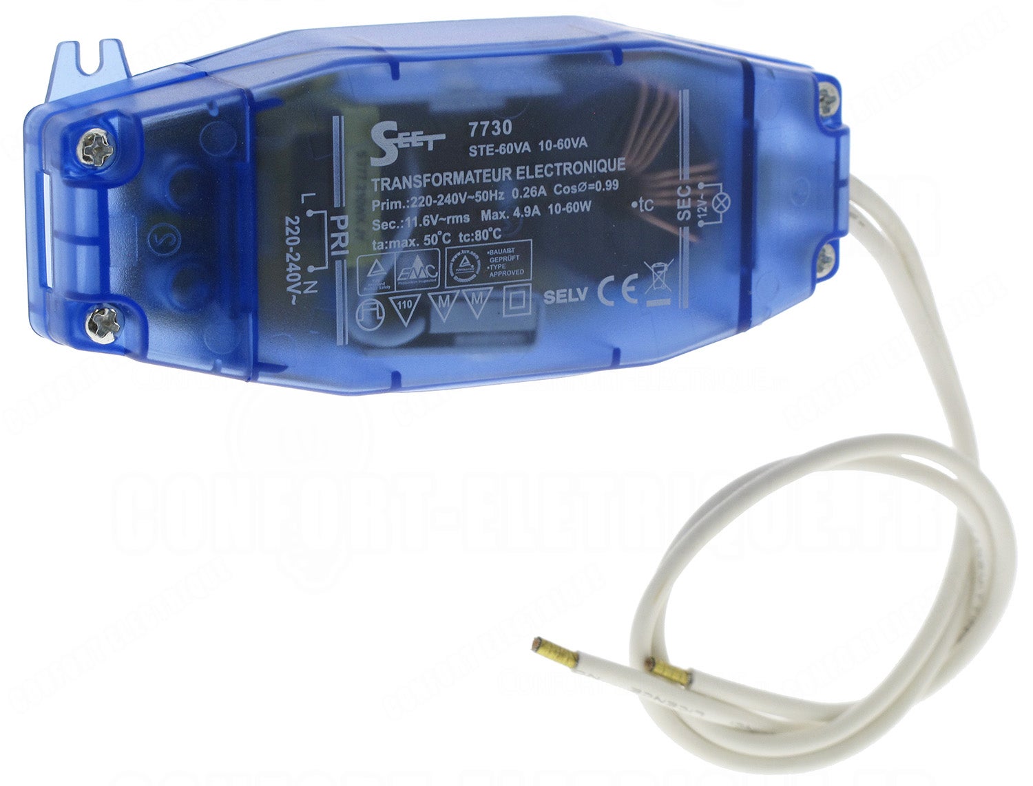 transformateur électronique 230 volts / 12volts d'une puissance de 10-60va. caractéristiques : transformateur 230 volts -> 12 volts. charge maximale : 60 va. indice de protection : ip20. dimensions : longueur : 110 mm. largeur : 43 mm. epaisseur : 24 mm. livré avec un cable de 30 cm de 2 x 1,5 mm2 en sortie du transformateur ( secondaire 12 volts).
