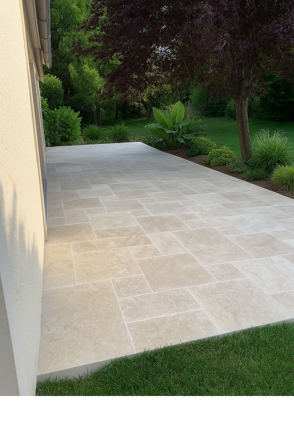 Apportez clarté et élégance à vos extérieurs avec le travertin Standard Light en Opus 4 formats.