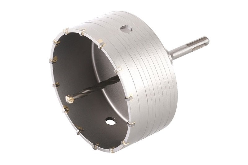 Trépan à molette avec lames SK et foret de guidage, Diam.125 mm Queue SDS : adapté pour marteaux-perforateurs SDS+ Plaquettes SK de haute qualité (SK - carbure fritté), longue durée de vie, pénétration rapide du matériau. Le foret de guidage - centrage facilite le travail et guide et maintient précisément la couronne à l'endroit souhaité pour percer de plus grands diamètres dans le béton, le béton cellulaire, les briques et autres matériaux muraux similaires. Le foret n'est pas adapté au perçage du béton armé