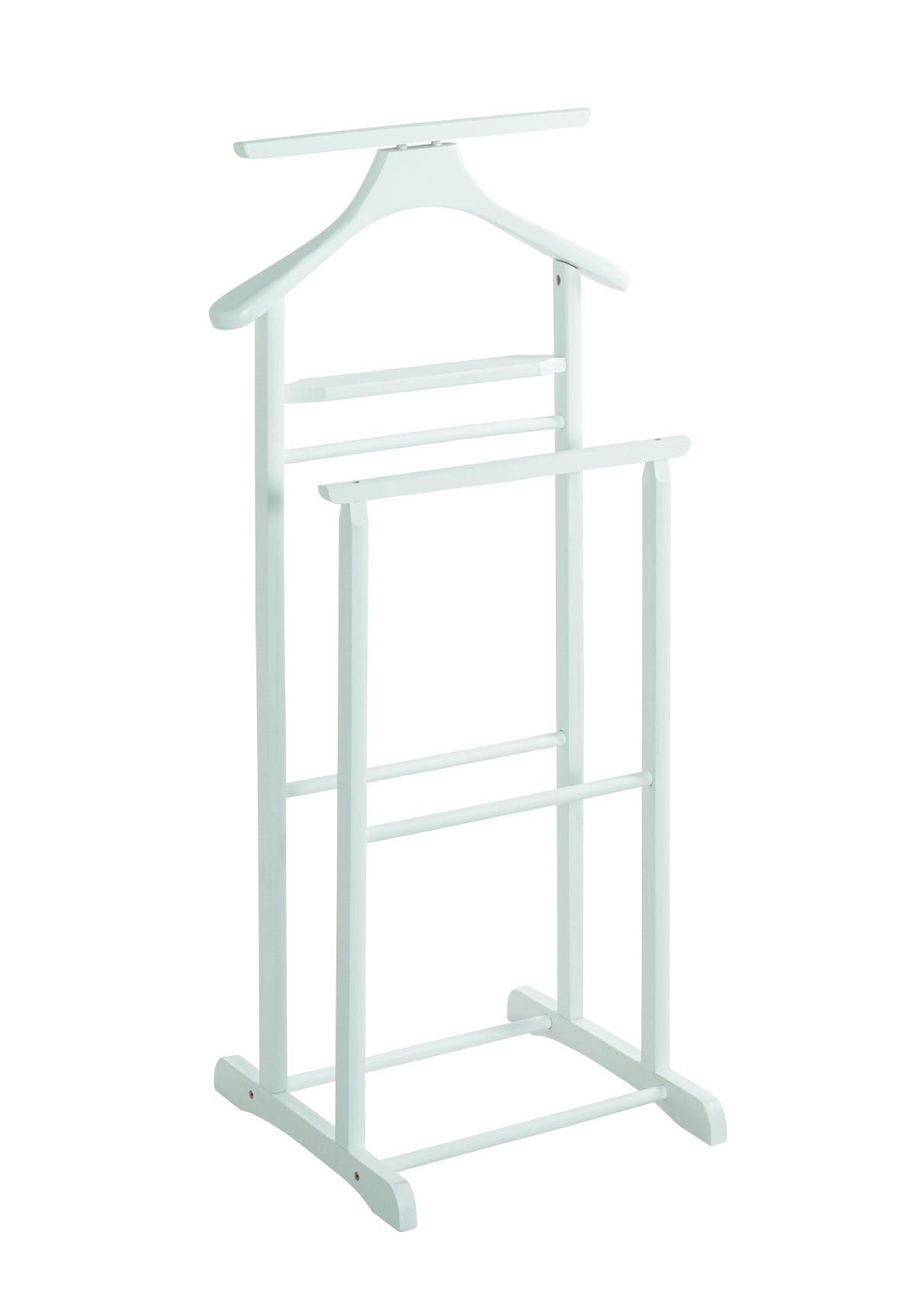 Ce valet de nuit double fabriqué en bois massif d'hévéa coloris blanc avec double structure anti froissement. Facile à monter. Dimensions : longueur 47 x profondeur 36 x hauteur 102 cm Matière : bois massif (hévéa) Coloris : Blanc. Poids : 2,3 Kg