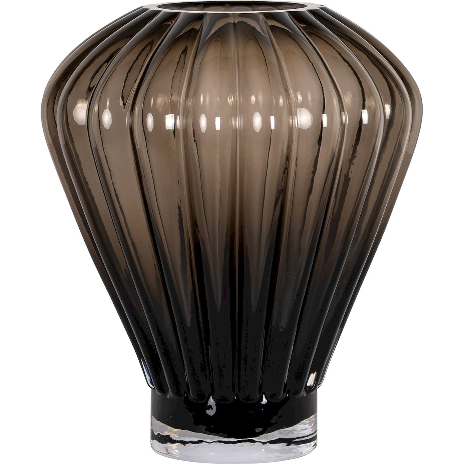 Vase décoratif en verre brun translucide à la silhouette large et élégante doté de rainures verticales qui accentuent sa forme raffinée La base épaisse et transparente contraste subtilement avec la teinte brune du corps Sa finition brillante et sa teinte neutre apportent une touche sophistiquée à tout espace intérieur Idéal pour mettre en valeur des fleurs ou comme pièce décorative seule ce vase allie modernité et charme intemporel parfait pour un salon une entrée ou une chambre