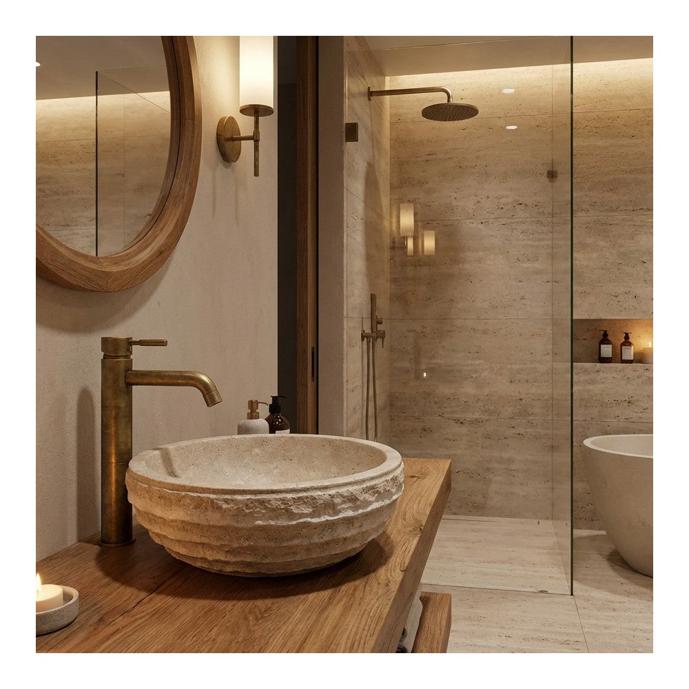 La pierre de Sinai, matériau noble, retrouve sa place de choix dans les intérieurs contemporains. Taillée dans un seul bloc, cette vasque offre un intérieur doux en contraste avec son extérieur texturé.