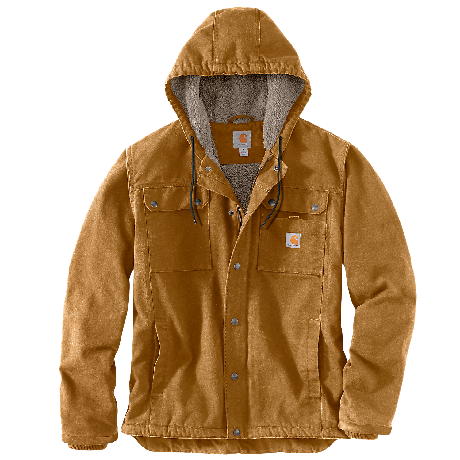 Blouson Cotton Duck à capuche • Conception ergonomique et soufflet au dos pour une plus grande aisance et une meilleure liberté de mouvements • Capuche 3 parties avec cordon de serrage réglable • Fermeture éclair centrale avec rabat tempête et boutons-pression • 2 poches intérieures : une à fermeture zip et une avec scratch • 2 poches poitrine fermeture boutons-pression avec poche scratch supplémentaire côté gauche et étiquette Carhartt® cousue • 2 poches sur le devant • Poignets anti-tempête en bords-côtes à l'intérieur des manches • Renforts Cordura® aux poignets • Coudes préformés • Dos allongé • Réglage taille par lacet • Coutures principales triples • Zip YKK® . Composition : 100% coton • Doublure sherpa sur le corps et matelassée en nylon dans les manches.