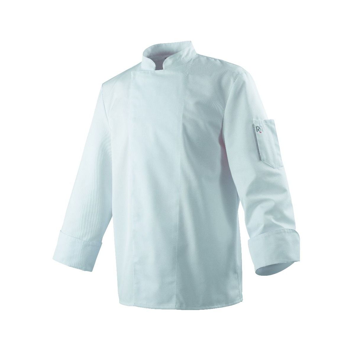 Cette veste à manches longues affiche un look épuré et élégant via son col officier, sa fermeture aux boutons-pressions cachés et son liseré contrasté sur la poche stylo de la manche gauche.