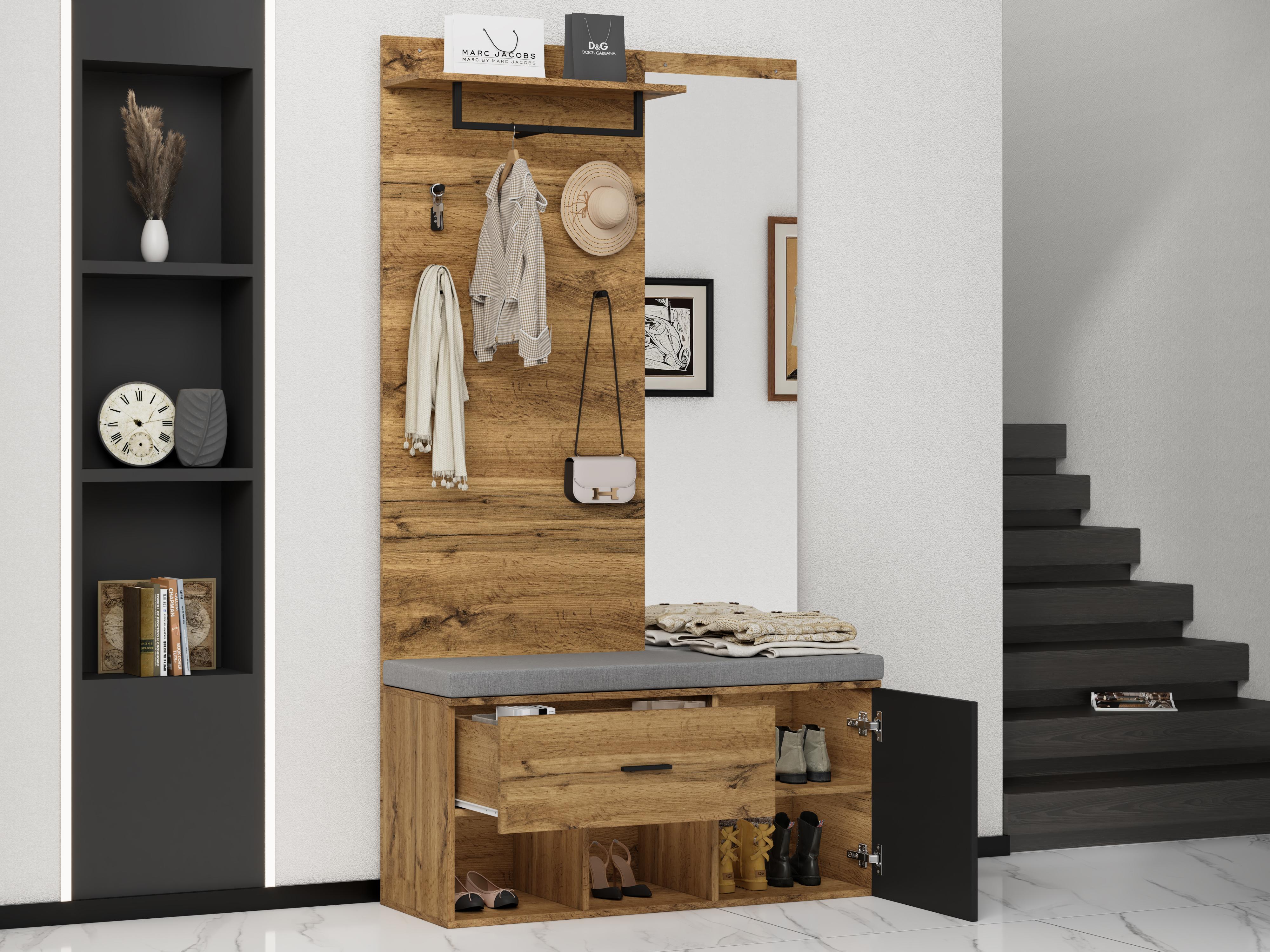 Complet avec miroir, tabouret à chaussures, tiroirs, étagères et armoire à chaussures, cet ensemble offre la meilleure solution d'organisation.