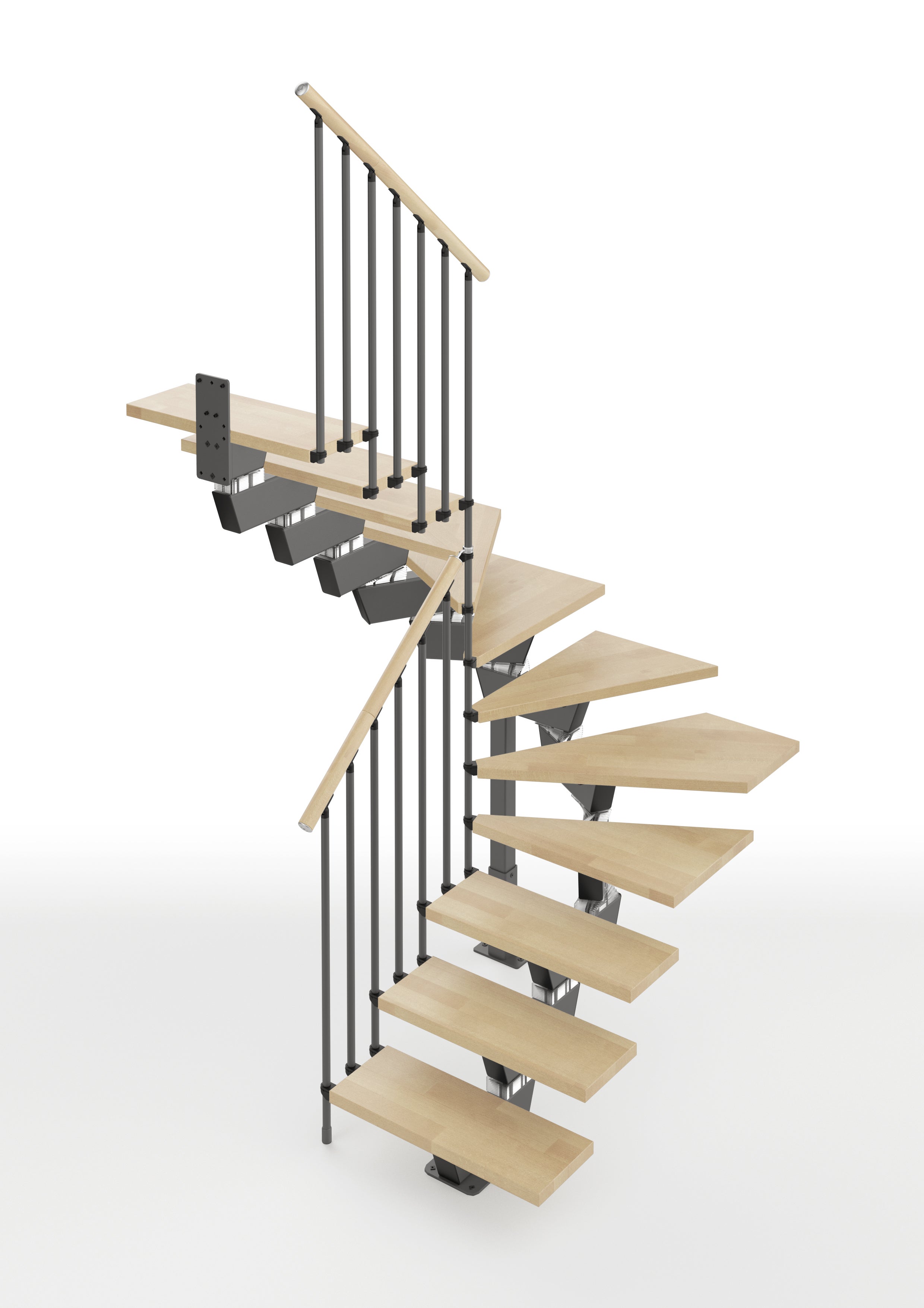 Vida - Escalier double quart tournant (U Forme - 2/4 tournant) - Largeur 65 cm - 12 Marches - 13 Contremarche - Rampe avec colonnes vertical (Modèle Tube) (un côté) - Main Courante Bois - Soutien au sol (35-100 cm) - Couleur Bois: Naturel 12 - Couleur Métal: Gris Anthracite