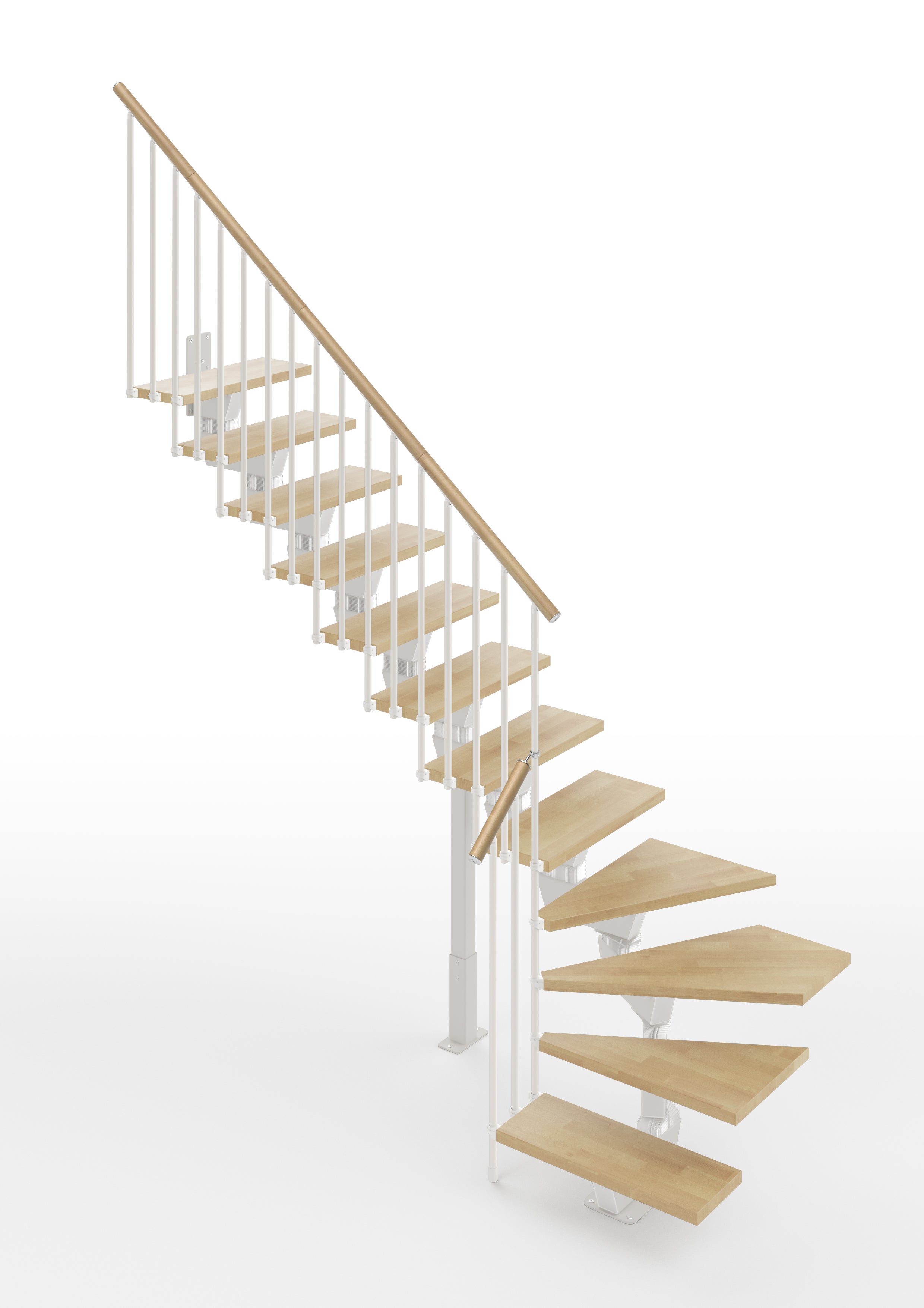 Vida - Escalier quart tournant (L Forme - 1/4 tournant) - Largeur 95 cm - 12 Marches - 13 Contremarche - Rampe avec colonnes vertical (Modèle Tube) (un côté) - Main Courante Bois - Soutien au sol (35-100 cm) - Couleur Bois: Naturel 12 - Couleur Métal: Blanc