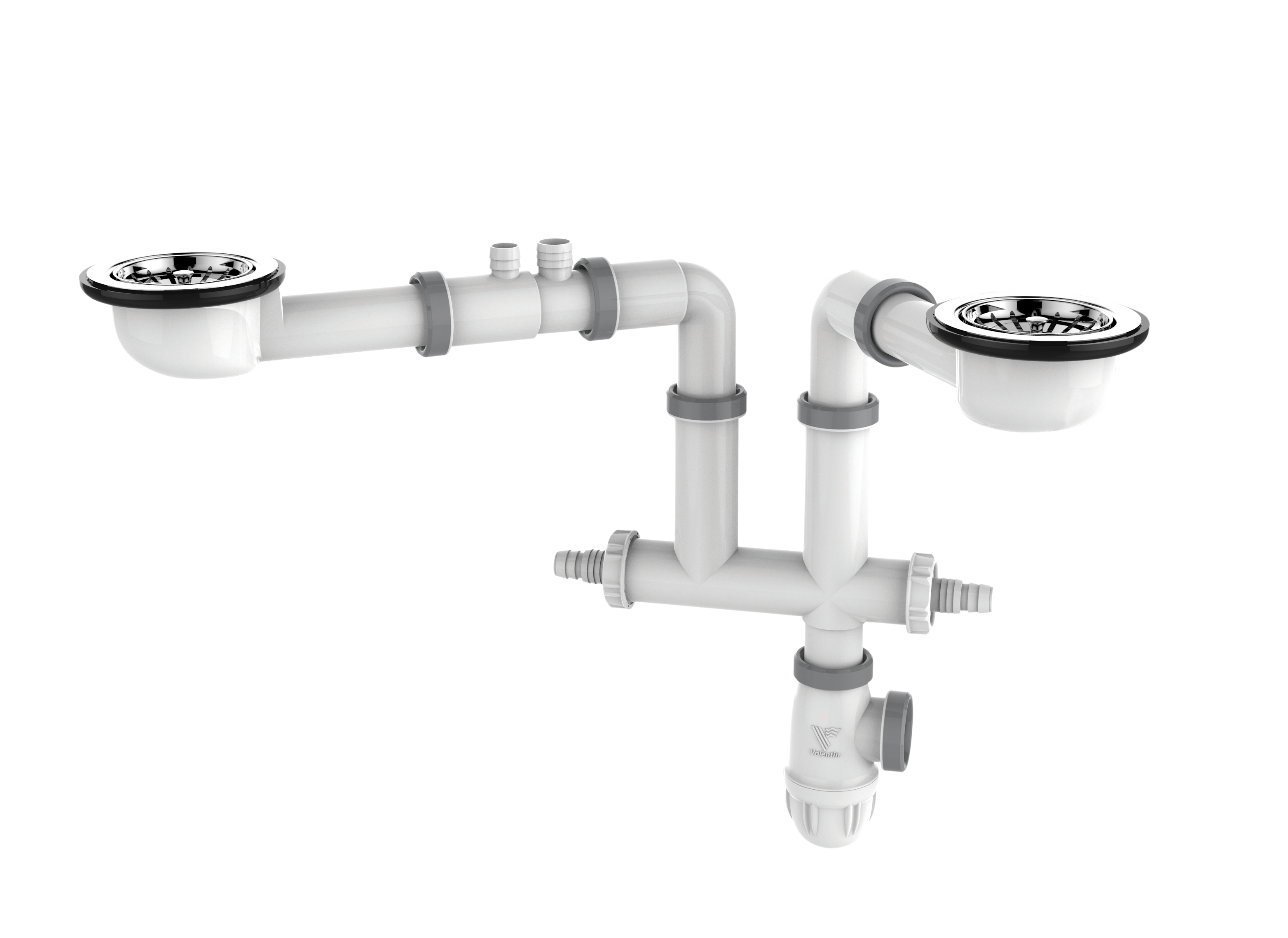 Vidage gain d'espace avec joints intégrés TBXP , Evier 2 cuves Ø90 sans trop-plein, Bondes à panier inox, H. sous évier 65mm, Sortie Ø40mm à emboîter, Débit : 36 l/mn, Montage rapide , Réglage H./l./P. , Prises MAL et TP
