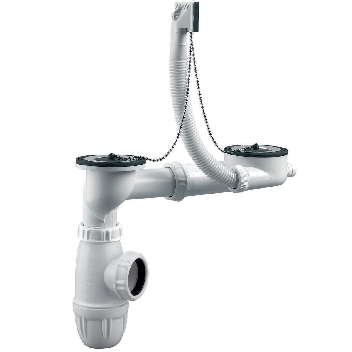 Vidage complet à bouchon avec trop plein pour évier 2 cuves inox en diamètre 50mm Le siphon d'une hauteur réglable, entre 62mm minimum à 97mm maximum, dispose d'une prise pour le raccordement d'une machine à laver. Sa capacité d'écoulement est de 55L par minute.