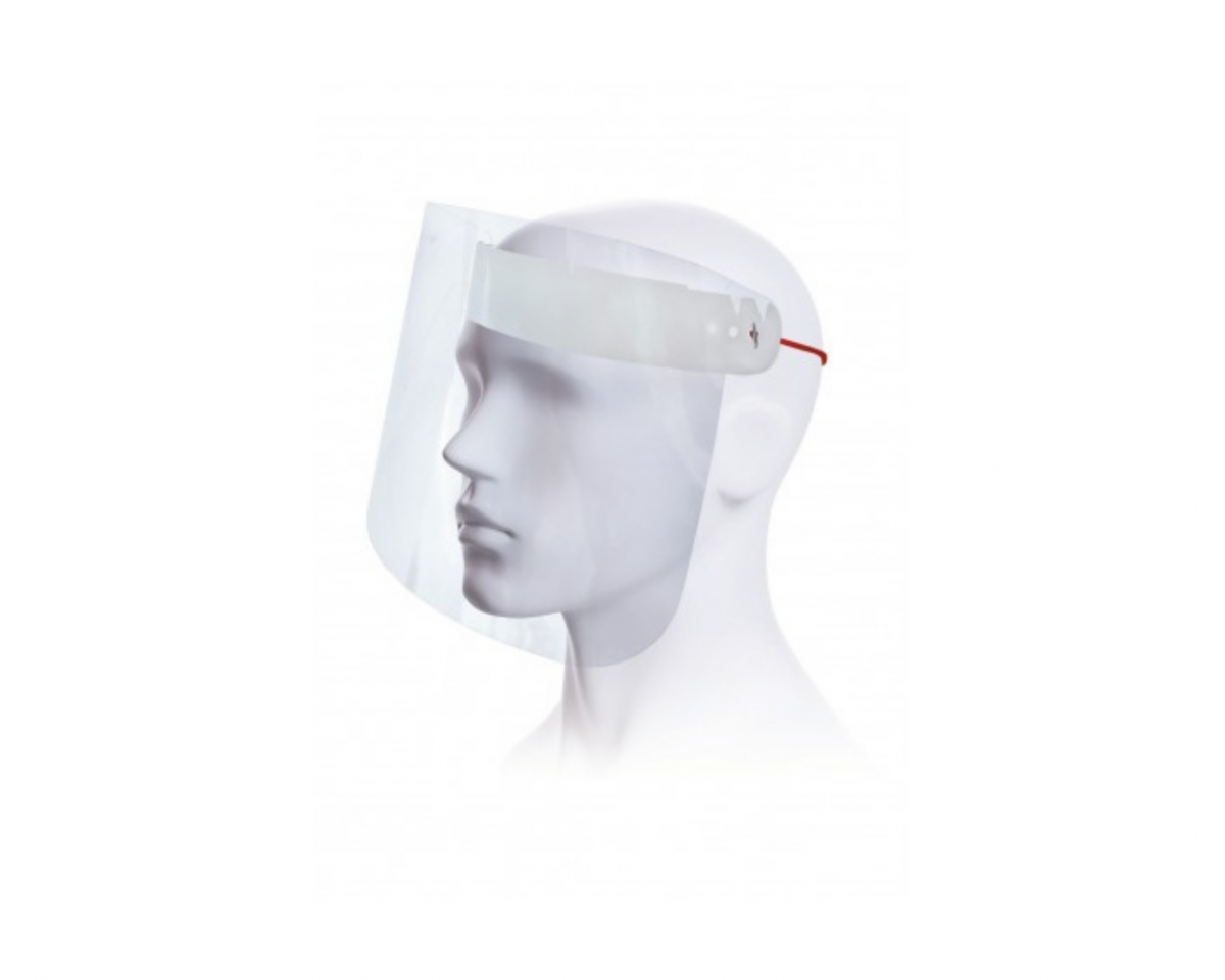 Visière APET 500 microns. Bande frontale polypropylène. Elastiques, 2 ferrets métal. Sachet de regroupement polypropylène 40 microns (livré à plat sous sachet individuel). Poids: 53g. Fabrication française.