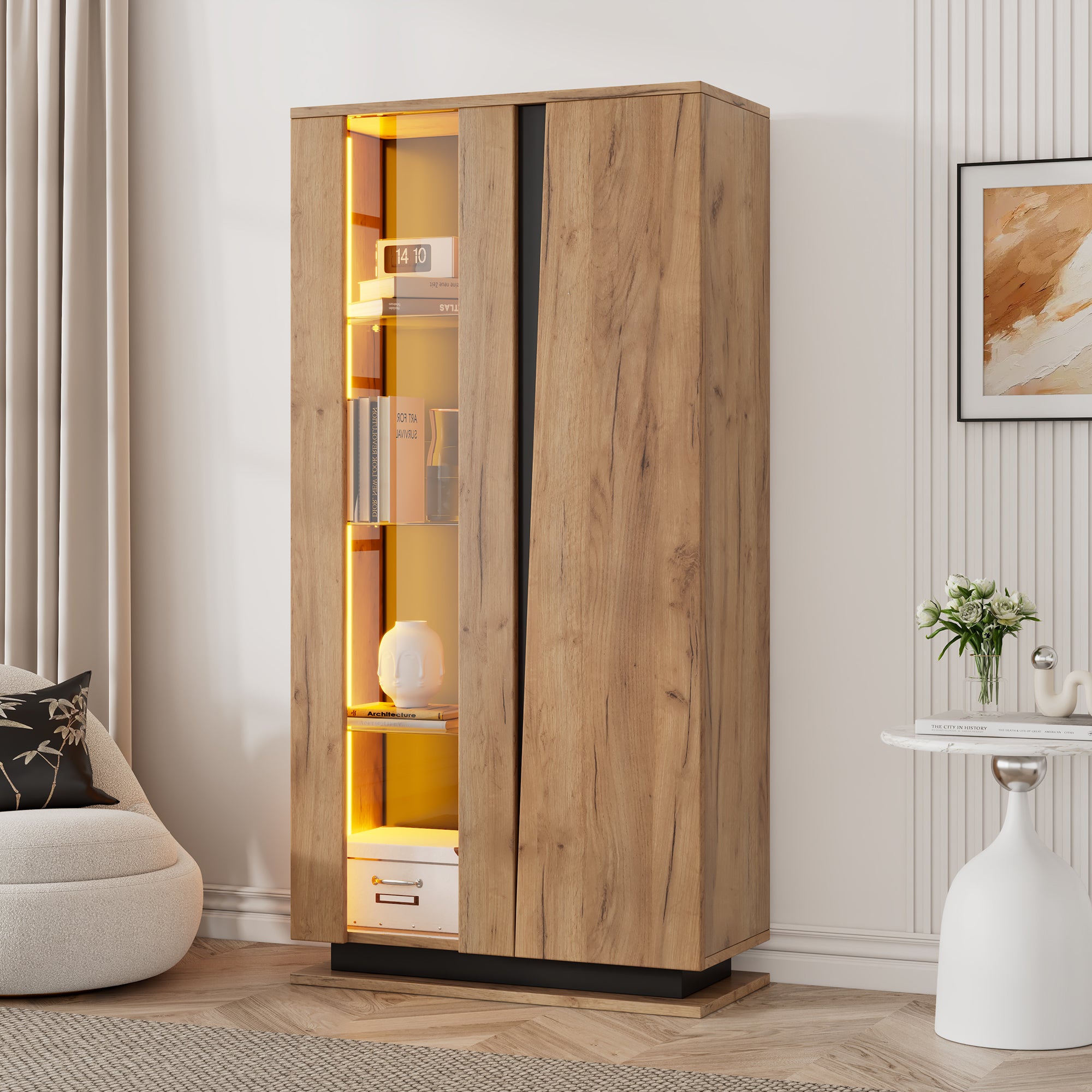 Détails bien pensés : Les séparateurs réglables accueillent des objets de différentes hauteurs, les portes en acrylique sont translucides et texturées, et la télécommande d'éclairage est pratique et intelligente. Chaque design est conçu pour améliorer la qualité de vie.