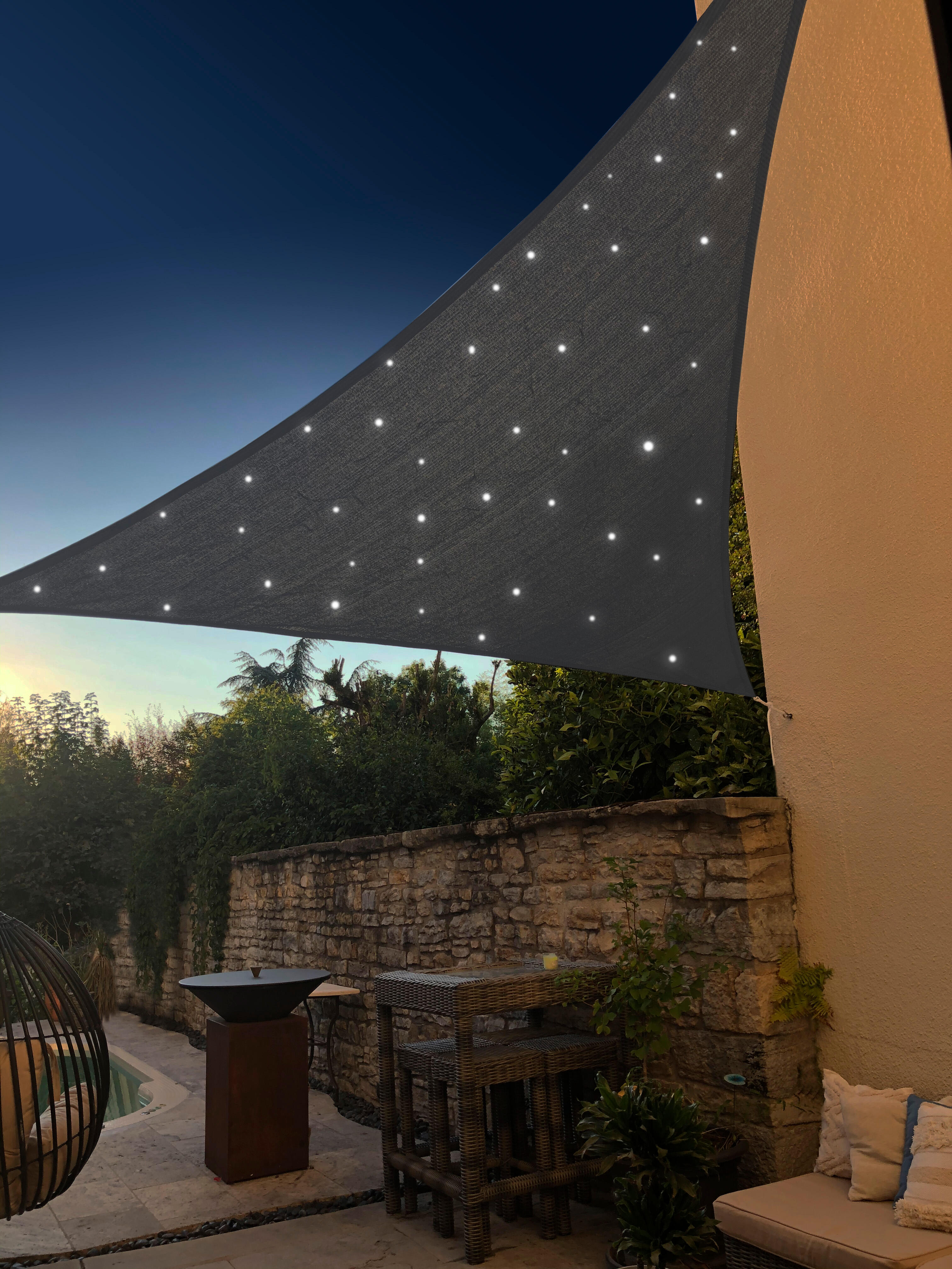 Voile d'ombrage triangulaire 3 m avec 75 leds solaires intégrées effet ciel étoilé. Toile austral, polyéthylène 160g/m², perméable et respirante. Energie solaire ou secteur (adaptateur secteur vendu séparément). Illumination en manuel ou en automatique (capteur solaire intégré avec détecteur crépusculaire). Ceinture de renfort 25 mm anti-déchirement aux extrémités et sur tout le périmètre. Anneau acier inox Ø 5 mm. Coloris gris ardoise.