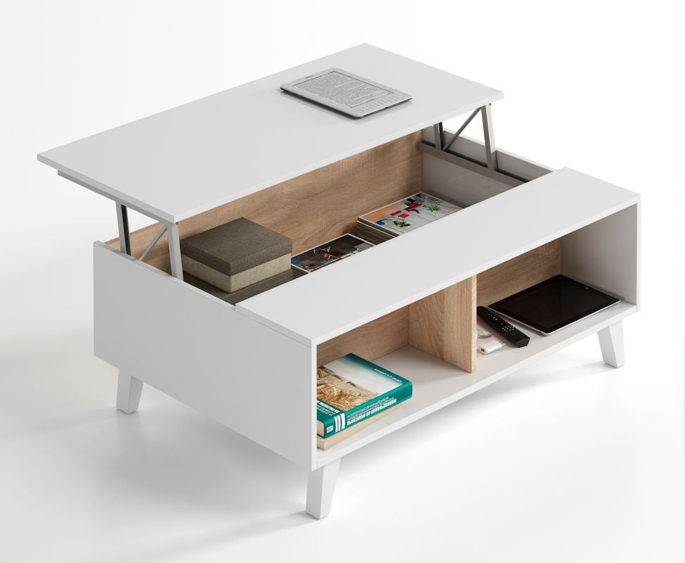 ZAIKEN PLUS Table basse en panneaux de particules blanc brillant et décor chene canadien - Style et design scandinave - 2 niches - plateau central relevable - Fabrication européenne - Dimensions totales : L 100 x P 68 x H 38 cm.