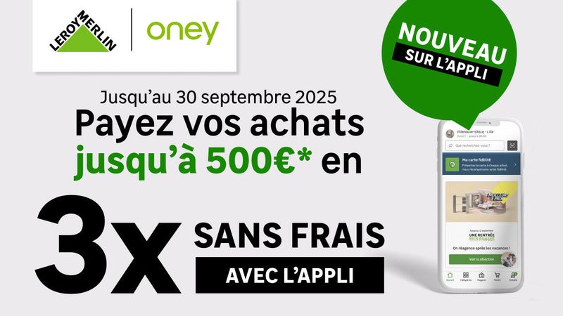 Sous réserve d’acceptation par Oney Bank. Offre valable uniquement dans les magasins Leroy Merlin Avignon, Tours Sud, Lyon Grand Parilly, Béziers, Boulogne sur Mer, Cabriès et Mundolsheim.