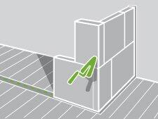 - Déposez de la colle à l'aide d'une truelle, entre les deux traits au sol, ainsi qu'à l'intérieur de la saignée du mur.