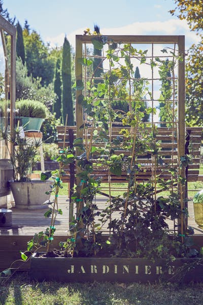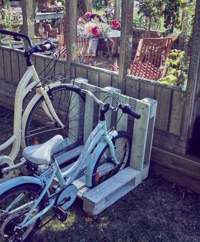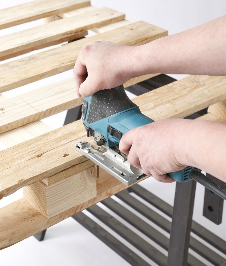 - Posez et vissez les étagères à l'aide des vis bois 5 x 80 mm, sur la partie supérieure des pieds de palettes en bas, puis au milieu