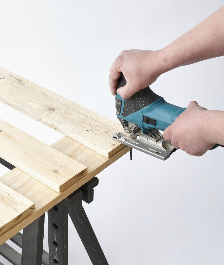 - Coupez les clous. Recoupez l'étagère à 64 x 54 cm. Récupérez les deux planches, puis recoupez-les à une longueur de 37 cm et vissez ces deux planches à l'extrémité de l'étagère à l'aide des vis bois 4 x 35 mm.
